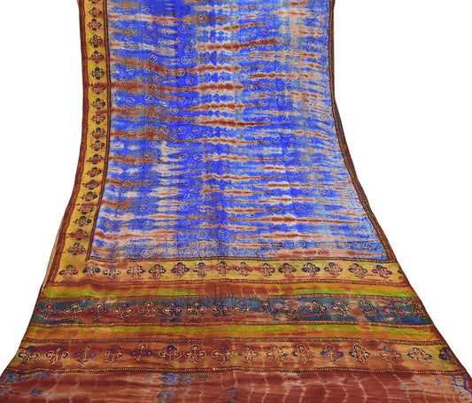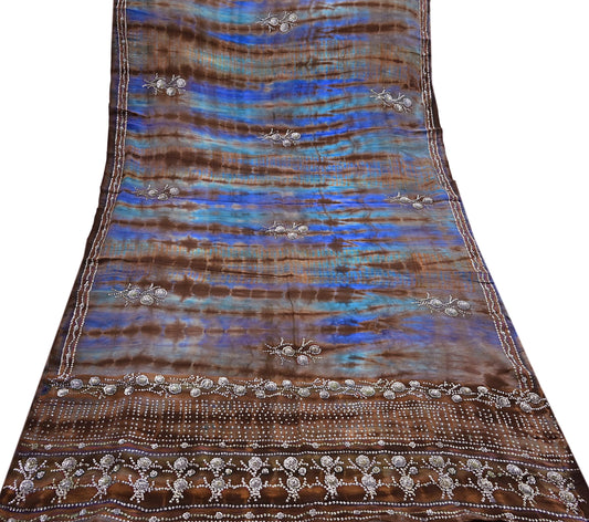 Indian Vintage Saree Brown & Blue Pure Crepe Silk Hand Embroidered Tie-Dye Sari Fabric 6yard Sewing Craft Fabric Dressmaking Crafting Zari
