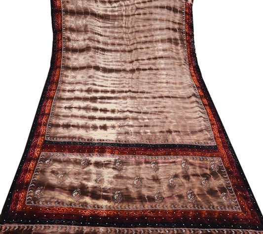 Indian Vintage Saree Brown & Beige Pure Crepe Silk Tie-Dye Embroidered Sari Fabric 5yard Sewing Floral Soft Zari