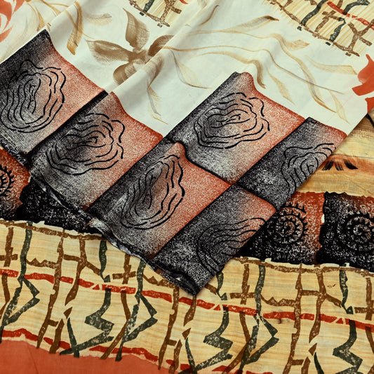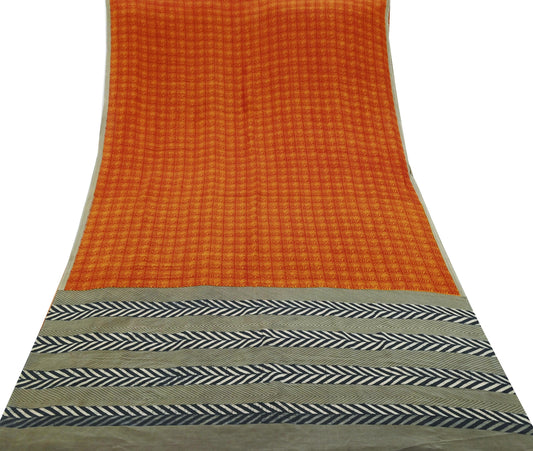 Indian Vintage Sari Orange & Black Pure Crepe Silk Printed Sarees 5yd Sewing Floral Soft Craft Fabric Ethnic Wrap Dress making Crafting