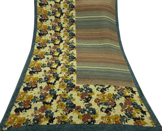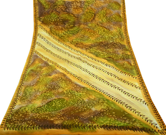 Indian Vintage Sari Green & Mustard Pure Crepe Silk Printed Sarees 5yd Sewing Floral Soft Craft Fabric Wrap Dress Making Crafting Quilting