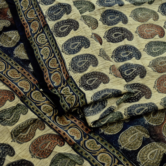 Indian Vintage Sari Beige Pure Crepe Silk Printed Sarees 5yd Sewing Paisley Soft Craft Fabric Wrap Dress making Crafting Quilting Used
