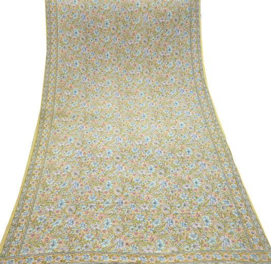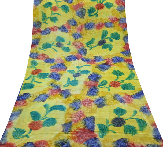 Indian Vintage Sari Yellow & Multi Pure Crepe Silk Block Printed Saree 5yd Sewing Floral Craft Fabric Wrap Dress making Crafting