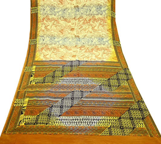 Indian Vintage Sari Ivory & Mustard Pure Crepe Silk Printed Sarees 6yd Sewing Soft Craft Fabric Wrap Dress Making Crafting Quilting Upcycle