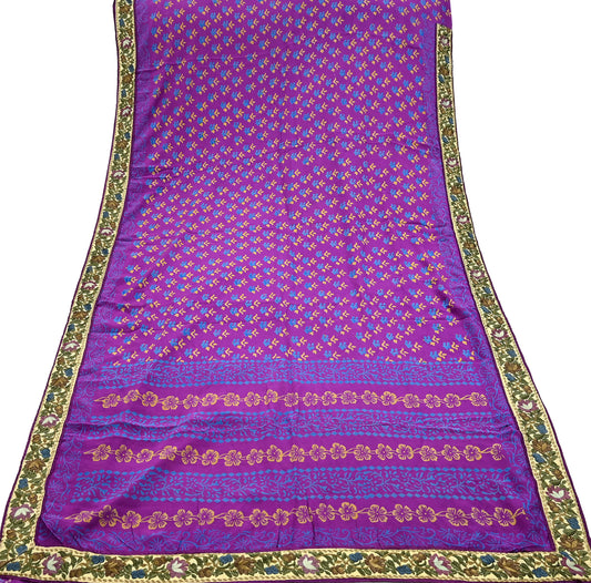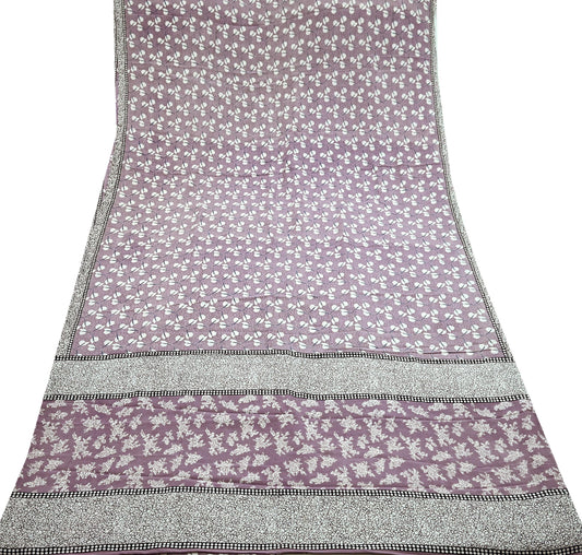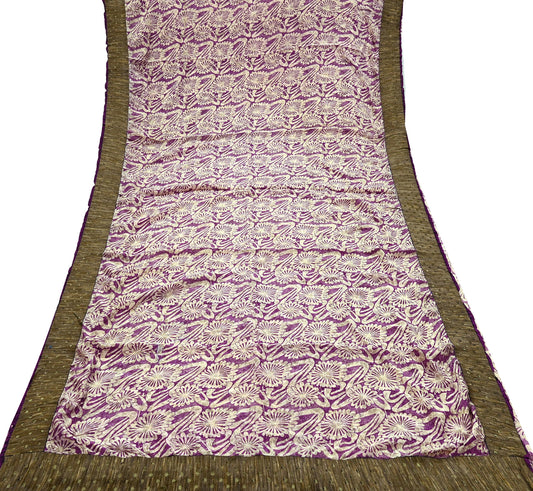 Indian Vintage Ivory & Purple Saree Pure Crepe Silk Printed Sari Craft Fabric 5yd Sewing Floral Soft Dress making For Crafting Quilting
