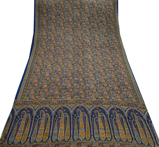 Indian Vintage Blue Saree Pure Crepe Silk Printed Sari Craft Fabric 5yd Sewing Paisley Soft Craft Fabric Wrap Dress making Quilting Upcycle