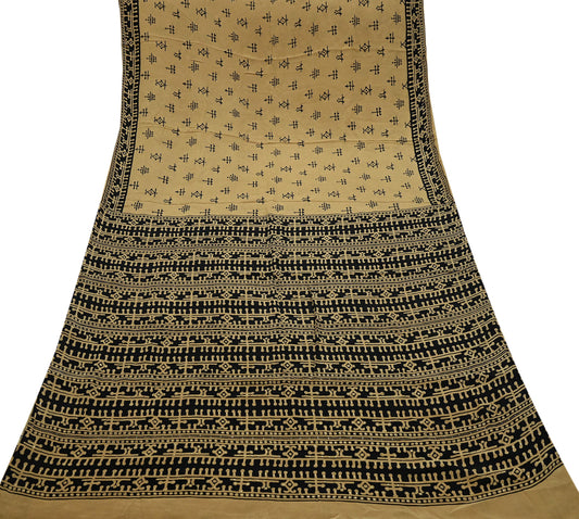 Indian Vintage Sari Beige Pure Crepe Silk Block Printed Sarees 6yd Sewing Floral Soft Craft Fabric Wrap Dress making Crafting Quilting Used