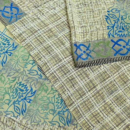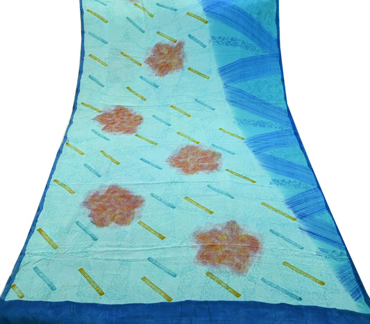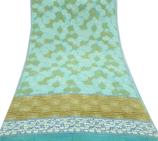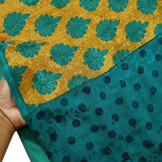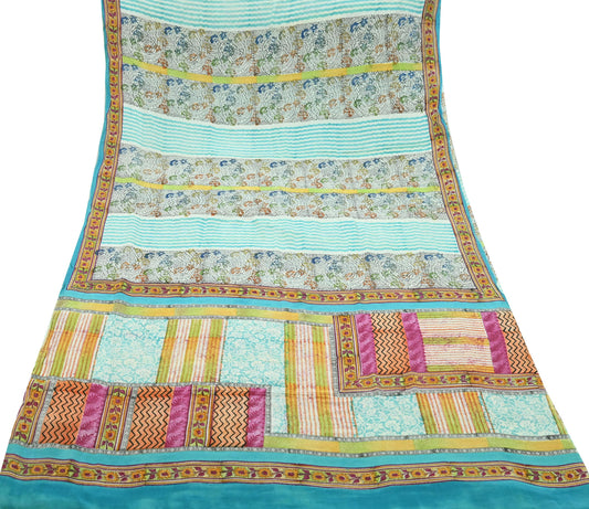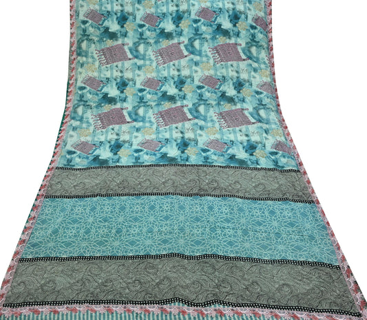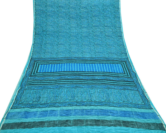 Indian Vintage Sari Blue & Green Pure Crepe Silk Printed Saree 5yd Sewing Soft Craft Fabric Wrap Dress making Quilting Crafting Upcycle