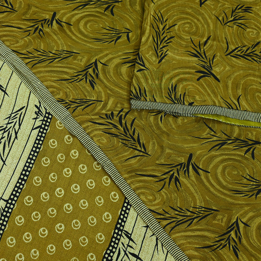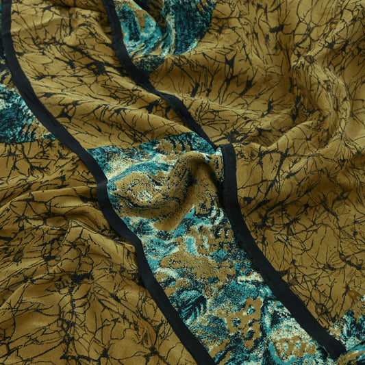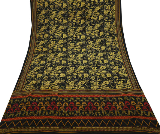 Indian Vintage Sari Mustard & Black Pure Crepe Silk Printed Sarees 5yd Sewing Soft Craft Fabric Floral Wrap Quilting Dress Making Crafting