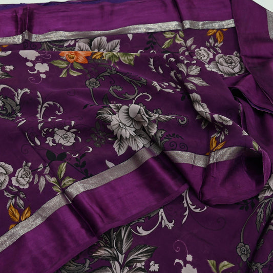 Indian Vintage Purple Saree Pure Crepe Silk Printed Sari Craft Fabric 5yd Sewing Floral Soft Wrap Dress making Crafting