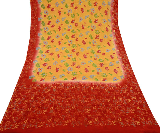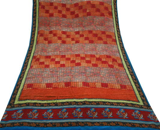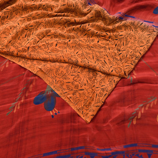 Indian Vintage Sari Orange & Red Pure Crepe Silk Printed Saree 5yd Sewing Floral Soft Craft Fabric Wrap Dress making Crafting Quilting