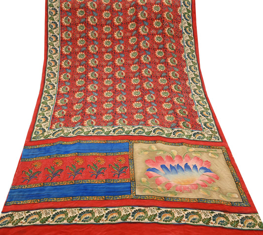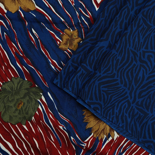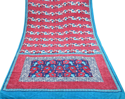 Indian Vintage Red & Blue Saree Pure Crepe Silk Printed Sari Craft Fabric 5yd Sewing Abstract Soft Craft Fabric Wrap Dress making