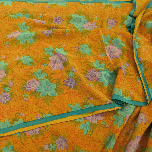 Indian Vintage Sari Green & Saffron Pure Crepe Silk Printed Sarees 5yd Sewing Floral Soft Craft Fabric Wrap Dress Making Crafting Quilting
