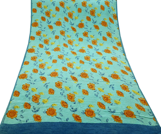 Indian Vintage Sari Blue & Green Pure Crepe Silk Printed Saree 5yd Sewing Floral Soft Craft Fabric Wrap Dress making Crafting Quilting