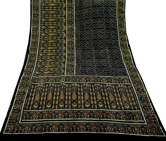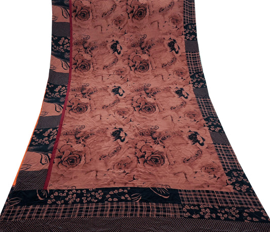 Indian Vintage Brown & Black Saree Pure Crepe Silk Printed Sari 5yd Sewing Floral Soft Craft Fabric Wrap Dress Making Crafting Quilting