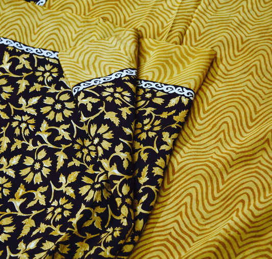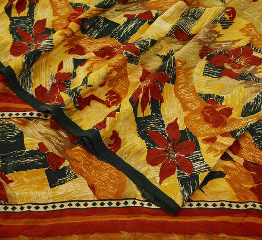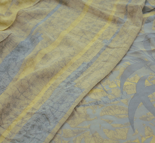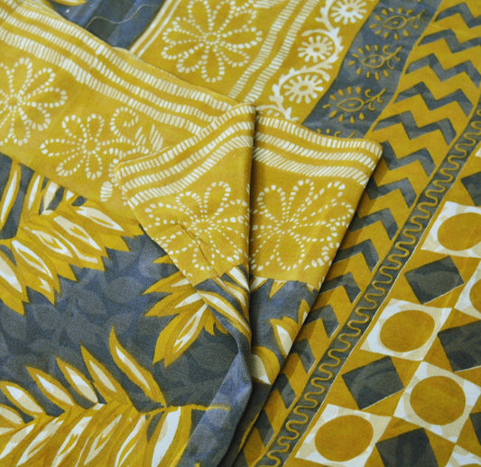 Indian Vintage Sari Mustard & Gray Pure Crepe Silk Printed Saree 5yard Sewing Floral Soft Craft Fabric Wrap