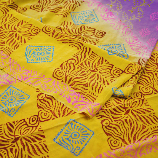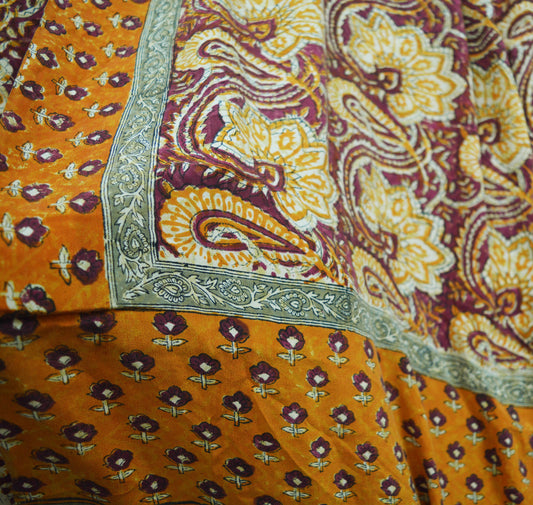 Indian Vintage Sari Yellow & Purple Pure Crepe Silk Block Printed Saree 5yard Sewing Floral Craft Fabric Wrap