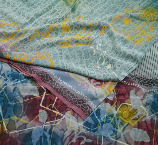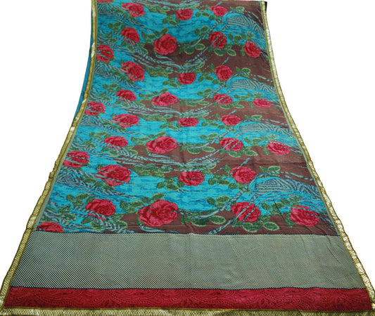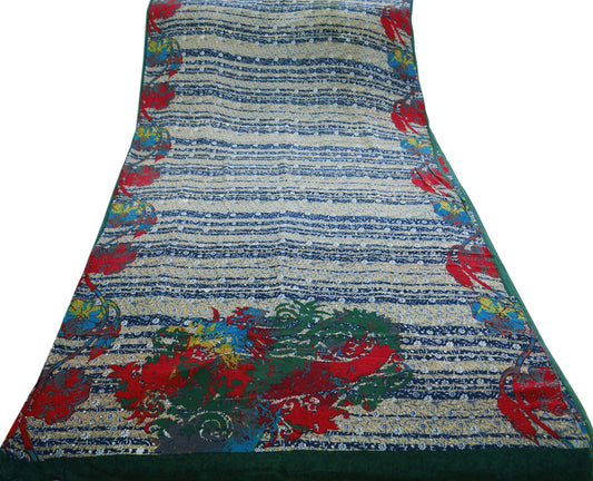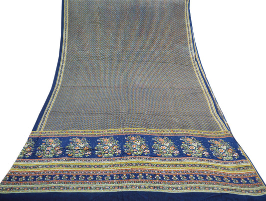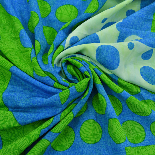 Indian Vintage Sari Blue & Green Pure Crepe Silk Printed Saree 5yd Sewing Soft Craft Fabric Wrap Dress making Quilting Crafting Upcycle