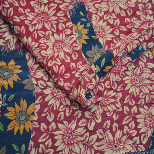 Indian Vintage Sari Blue & Maroon Pure Crepe Silk Printed Saree 5yard Sewing Floral Soft Craft Fabric Wrap