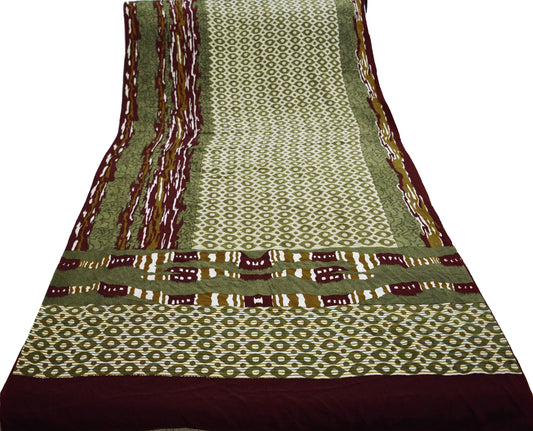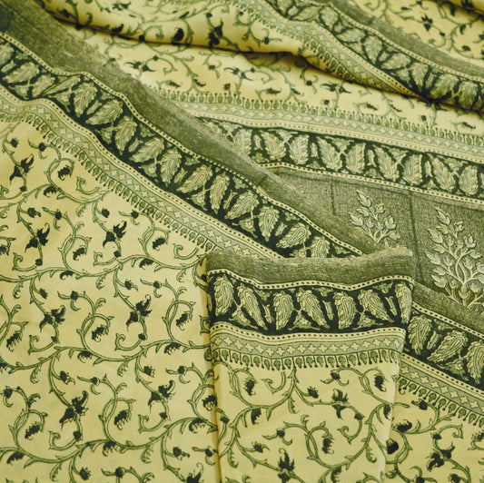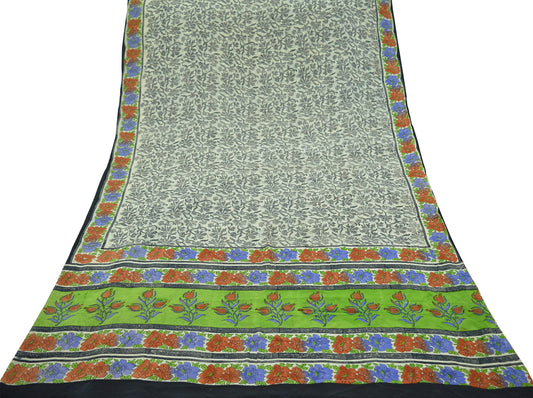 Indian Vintage Sari Ivory & Green Pure Crepe Silk Printed Saree 5yard Sewing Abstract Soft Craft Fabric Wrap