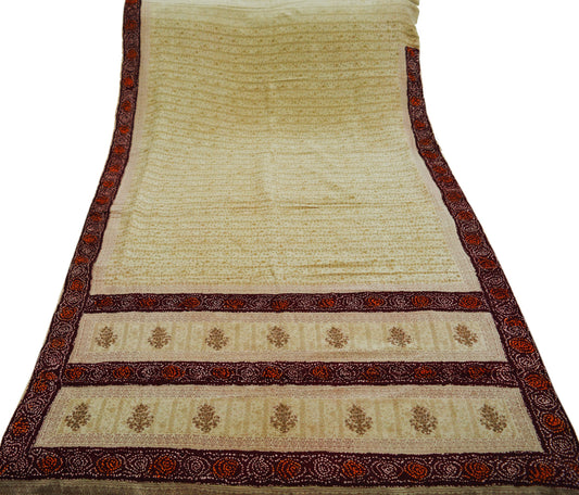 Indian Vintage Sari Beige Pure Crepe Silk Block Printed Saree 5yard Sewing Quilting Soft Craft Fabric Wrap Bandhani Border