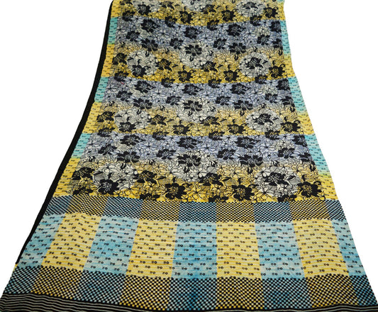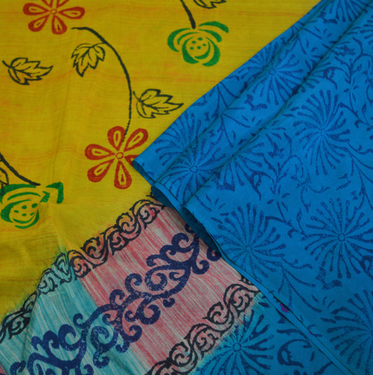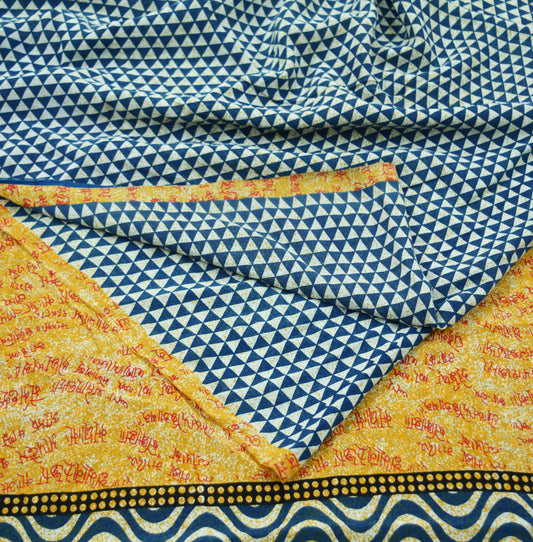 Indian Vintage Sari Blue & Yellow Pure Crepe Silk Block Printed Saree 5yard Sewing Floral Craft Fabric Wrap