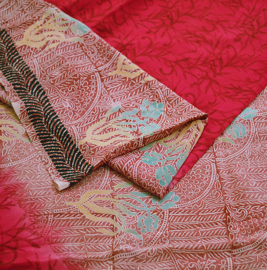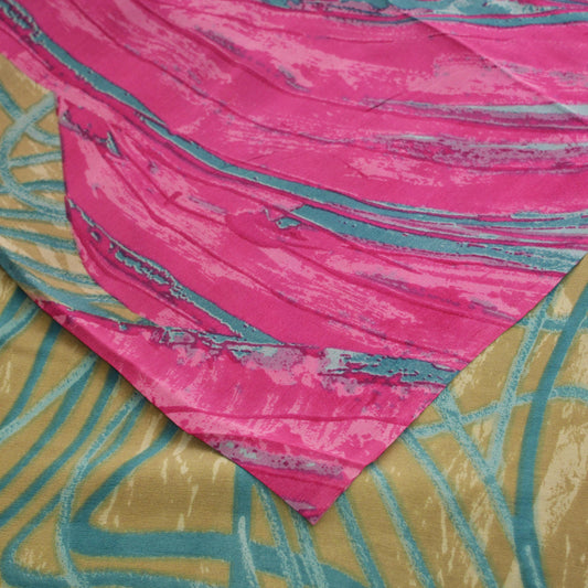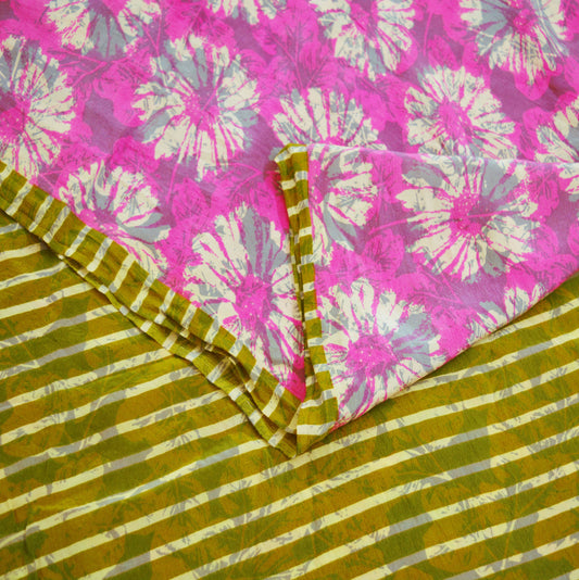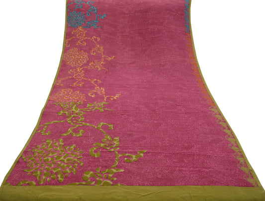 Indian Vintage Sari Green & Pink Pure Crepe Silk Printed Saree 5yd Sewing Craft Fabric Abstract Soft Wrap Dress Making Quilting Crafting