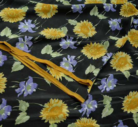 Indian Vintage Sari Black Pure Crepe Silk Printed Saree 5yard Sewing Floral Craft Fabric Wrap