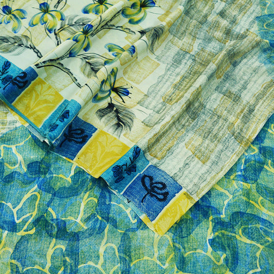 Indian Vintage Sari Ivory & Blue Pure Crepe Silk Printed Saree 5yard Sewing Floral Soft Craft Fabric Wrap