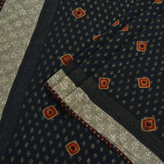 Indian Vintage Sari Black & Saffron Pure Crepe Silk Printed Saree 5yard Sewing Soft Craft Fabric Ethnic Wrap