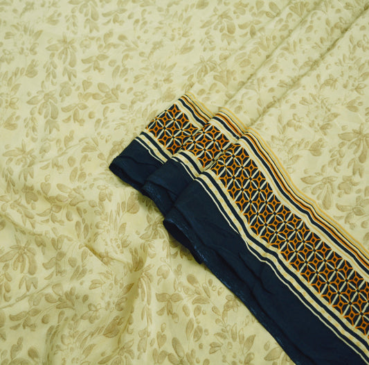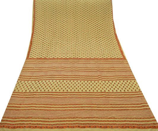 Indian Vintage Sari Beige Pure Crepe Silk Block Printed Sarees 5yd Sewing Floral Soft Craft Fabric Wrap Dress making Upcycle Crafting