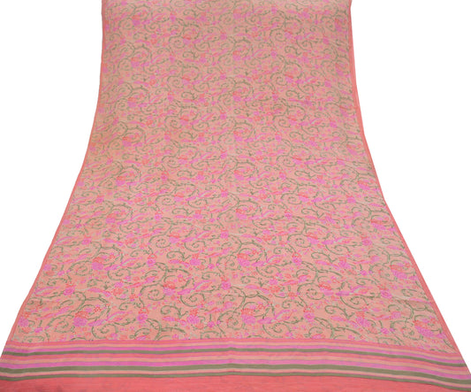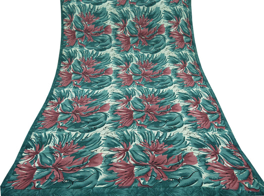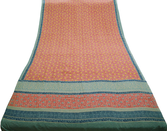 Indian Vintage Sari Green & Pink Pure Crepe Silk Printed Saree 5yard Sewing Floral Soft Craft Fabric Wrap
