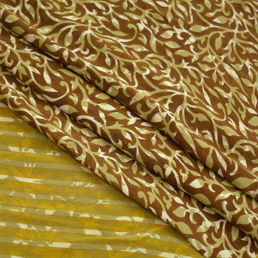 Indian Vintage Green & Brown Saree Pure Crepe Silk Printed Sari Craft Fabric 5yd Sewing Floral Soft Craft Fabric Wrap Quilting Crafting