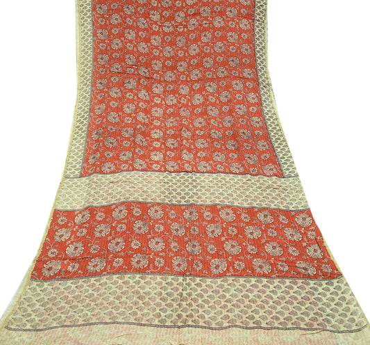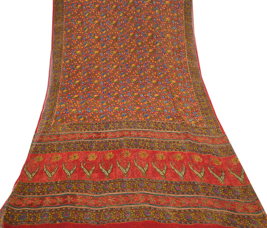 Indian Women Vintage Sari Beige & Orange 100% Pure Georgette Silk Printed Saree Sewing 5yd Soft Craft Floral Design Wrap Boho