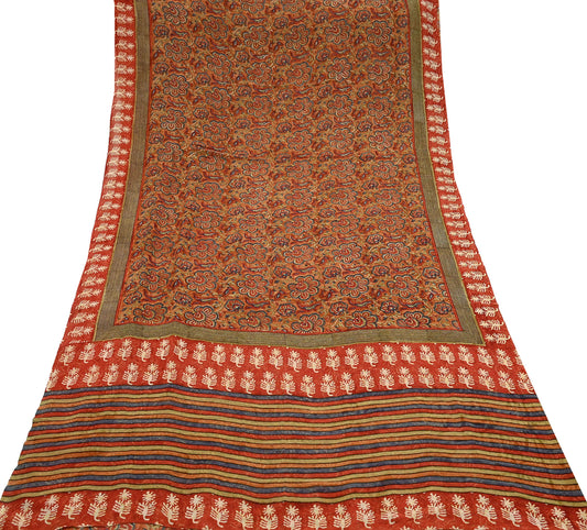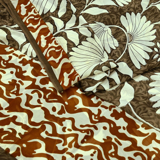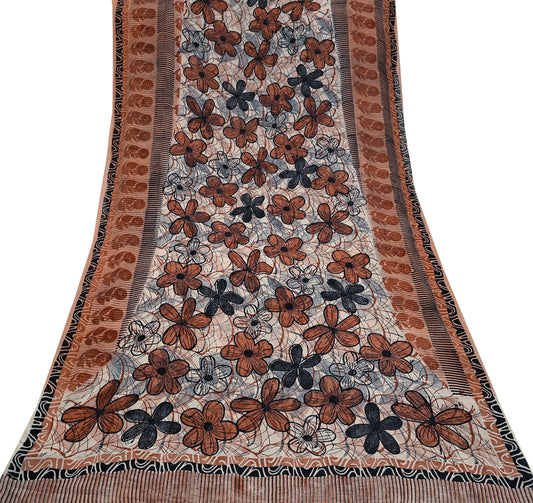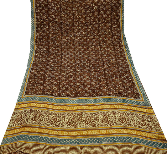 Indian Vintage Sari Brown & Ivory 100% Pure Georgette Silk Block Printed Sarees Sewing 5yd Craft Soft Dress Designing for Crafting Floral