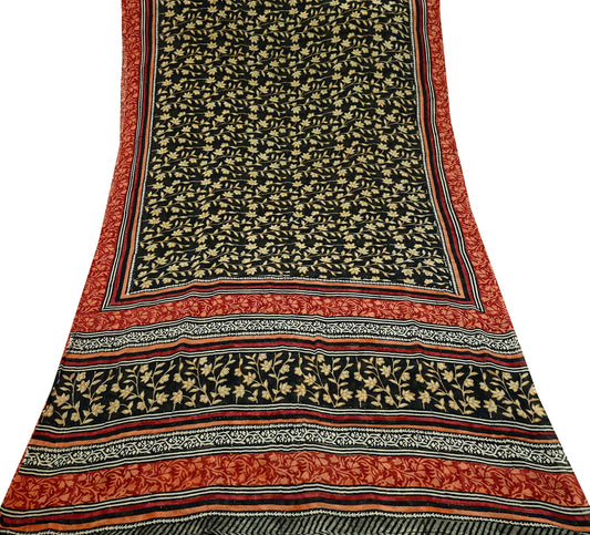 Indian Vintage Sari Black 100% Pure Georgette Silk Block Printed Sarees Sewing 5yd Craft Soft Dress Designing for Crafting Floral