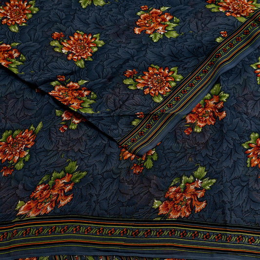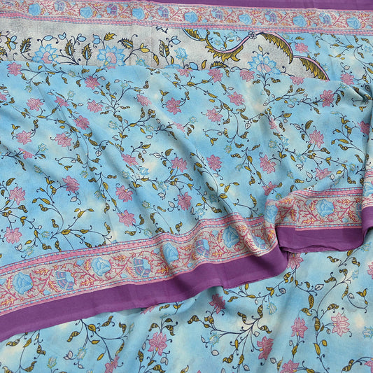 Women Vintage Sari Blue Pure Georgette Silk Digital Printed Saree Craft Fabric Sewing 5Yd Light Dress Making Floral Crafting