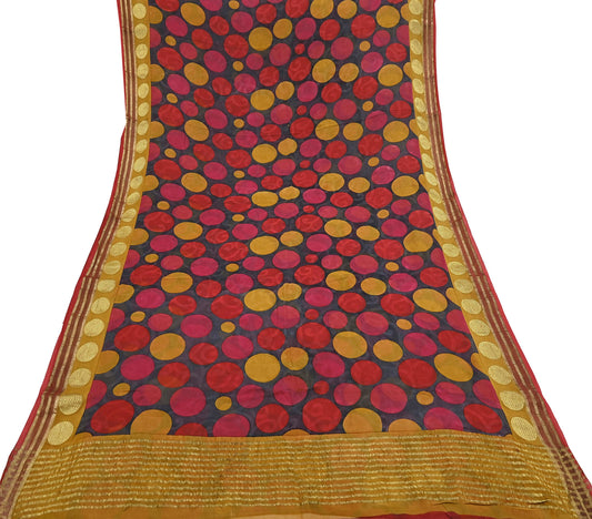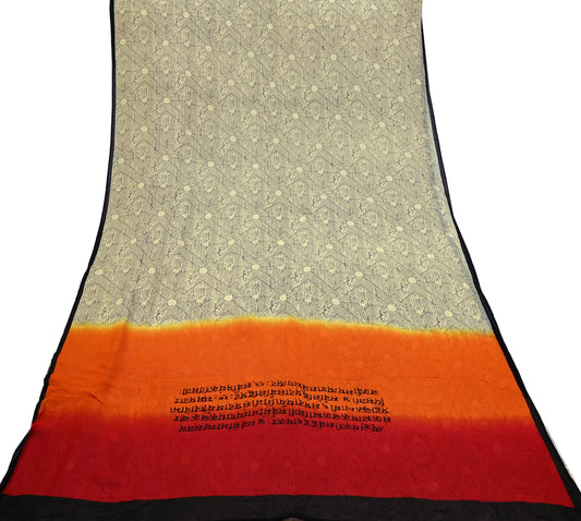 Women Vintage Sari Saffron & Gray Pure Georgette Silk Printed Saree Craft Fabric Sewing 5Yard Soft Light Dress Making Polka Dot Zari Border