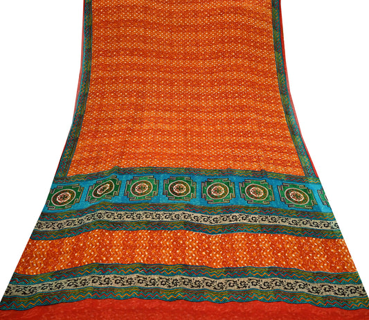 Indian Vintage Sari Orange & Red 100% Pure Georgette Silk Block Printed Sarees Sewing 5yd Craft Soft Dress Designing for Crafting Abstract