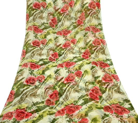 Indian Vintage Sari Ivory & Green Pure Georgette Silk Printed Sarees 6Yd Craft Fabric Sewing Quilting Crafting Dress Making