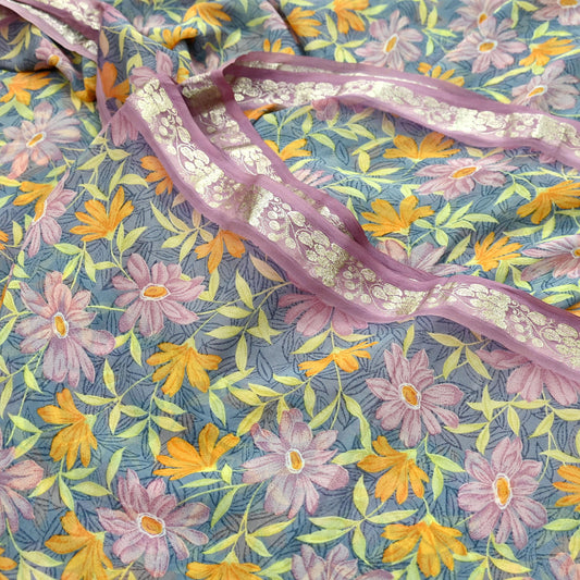 Women Vintage Sari Blue Pure Georgette Silk Printed Saree Craft Fabric Sewing 5Yard Soft Light Dress Making Floral Zari