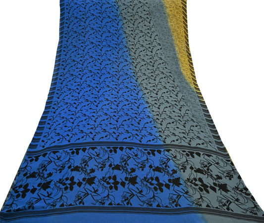 Women Indian Vintage Sari Blue Pure Georgette Silk Printed Sarees Craft Fabric Sewing 5Yd Soft Dress Making Quilting Crafting