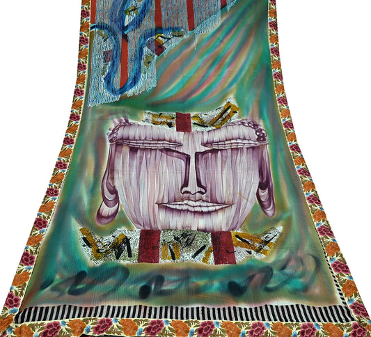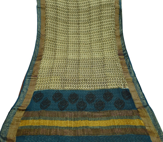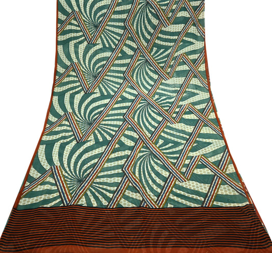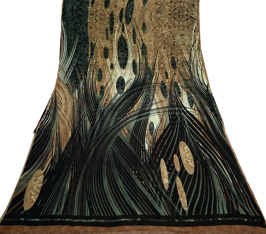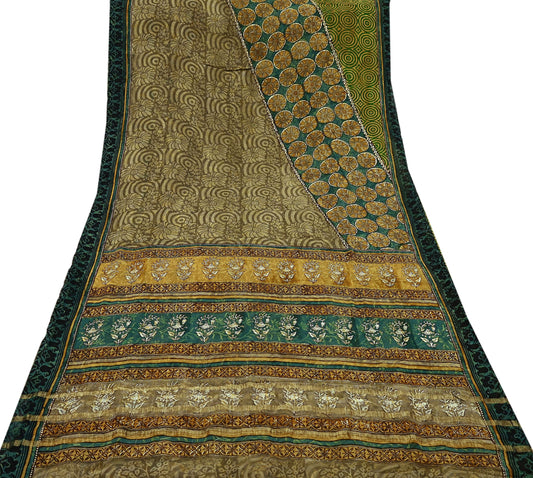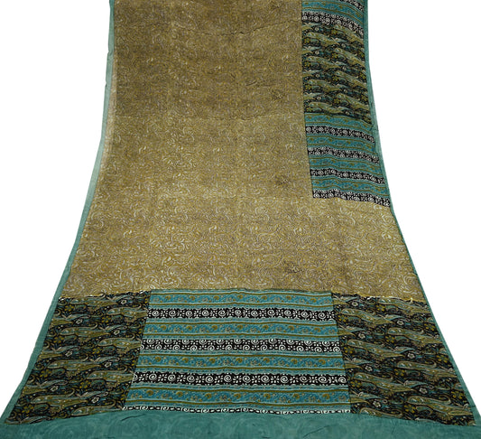 Indian Vintage Sari Green & Beige Pure Georgette Silk Printed Sarees Craft Fabric Sewing 5Yd Soft Dress Making Crafting Quilting Upcycle