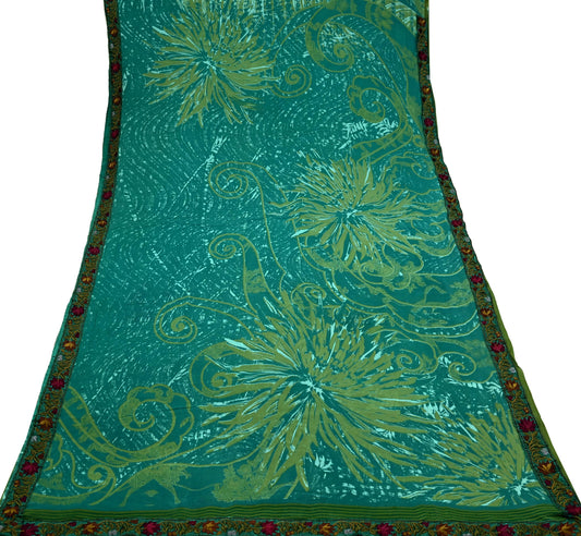 Women Vintage Sari Green Pure Georgette Silk Printed Saree Craft Fabric Sewing 6Yd Soft Light Dress Making Floral Quilting