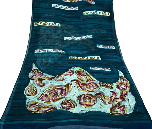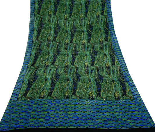 Indian Vintage Sari Blue & Green 100% Pure Georgette Silk Printed Sarees Sewing 5yd Craft Soft Dress Designing for Crafting Abstract