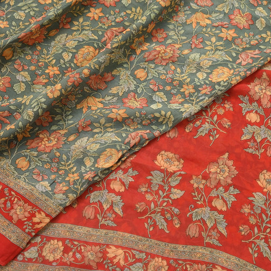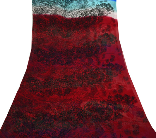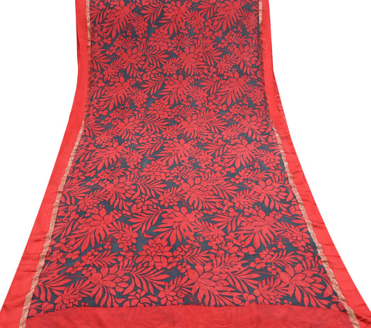 Women Vintage Sari Red & Gray Pure Georgette Silk Printed Saree Craft Fabric Sewing 5Yd Soft Light Dress Making Floral Crafting Quilting