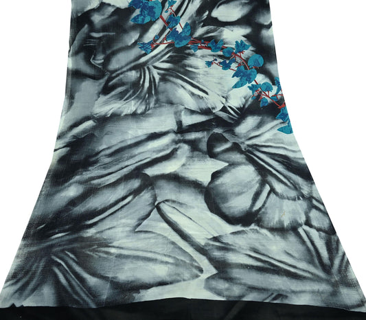 Women Indian Vintage Sari Gray & Black Pure Georgette Silk Printed Sarees Craft Fabric Sewing 5Yd Soft Dress Making Floral Quilting Crafting