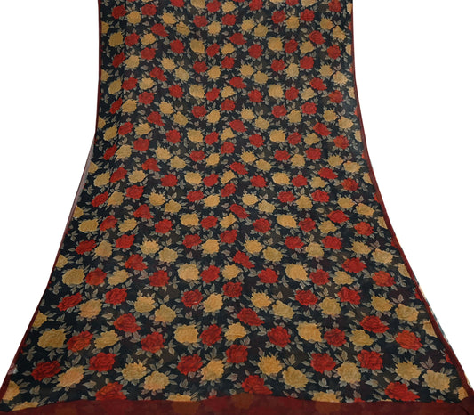 Indian Women Vintage Sari Black & Maroon 100% Pure Georgette Silk Printed Saree Sewing 5yd Soft Craft Fabric Dress Making Dress Designing
