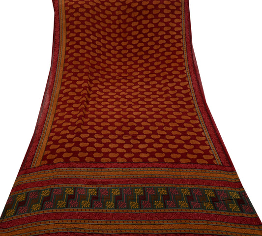 Women Vintage Sari Maroon Pure Georgette Silk Printed Saree Craft Fabric Sewing 6Yd Soft Light Dress Making Floral Quilting Paisley