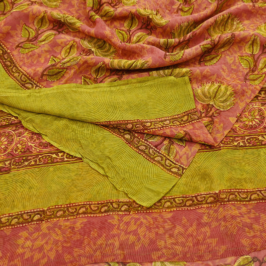 Indian Women Vintage Sari Pink & Green Pure Georgette Silk Printed Saree Sewing 5yd Soft Craft Abstract Design Wrap Boho