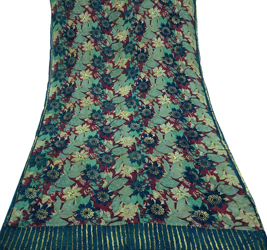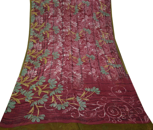 Indian Vintage Sari Green & Maroon Pure Georgette Silk Printed Sarees 5Yd Craft Fabric Sewing Soft Dress Making Floral Quilting Used Upcycle